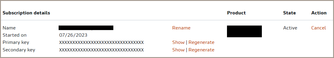 To re-generate your Subscription key, make sure you logged in then click on your profile in the navigation bar at the top of the screen. On your profile, click on the 'Regenerate' button next to the primary key of the Product Subscription you would like to change. Note that the old key will be revoked immediately as part of this action.