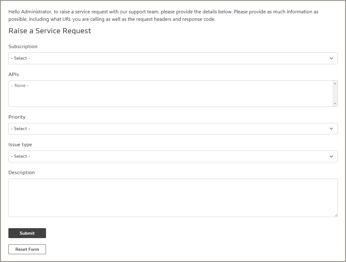 Select the App and associated API Product/s most relevant to the support request. Next select the priority of the support request. Generally you should select Critical for issues affecting your production use of our API that is impacting business; use High for items that have the potential to risk business critical traffic and Low for everything else. Select the most relevant item from the list of Issue Types and then provide a description of your issue or request. Useful information to provide includes: